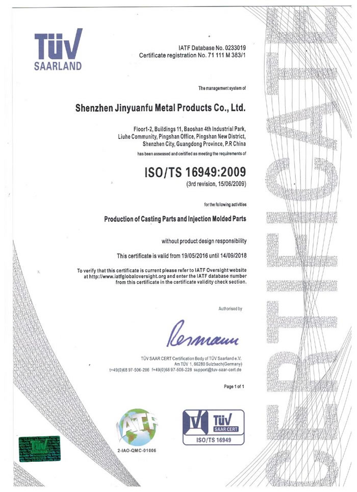 深圳市金源福五金制品有限公司成立于2003年。公司拥有10000多平方米生产厂地、开发与管理精英人才、技术专业、设备精良、交通便利、服务周全、具体设计、开发、制模、出样、生产到成品出货一体化模式生产厂家。已通过ISO9001:2008ISO1440/TS16949:2009国际质量体系认证。专业生产锌合金压铸、铝合金压铸产品、汽车配件、汽车后视镜支架、车载导航散热器、LED散热器、LED灯罩、数码电子五金结构件、家具五金装饰件、标牌(LOGO)等五金压铸产品。