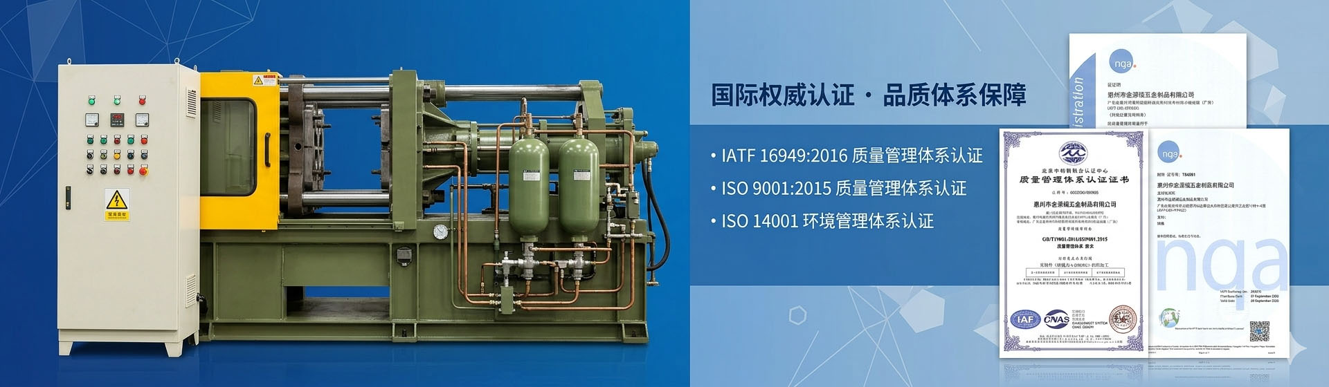 专注于铝合金压铸件研发与生产,拥有 ISO9001:2015、ISO14001:2015、IATF16949:2016 等权威资质认证。